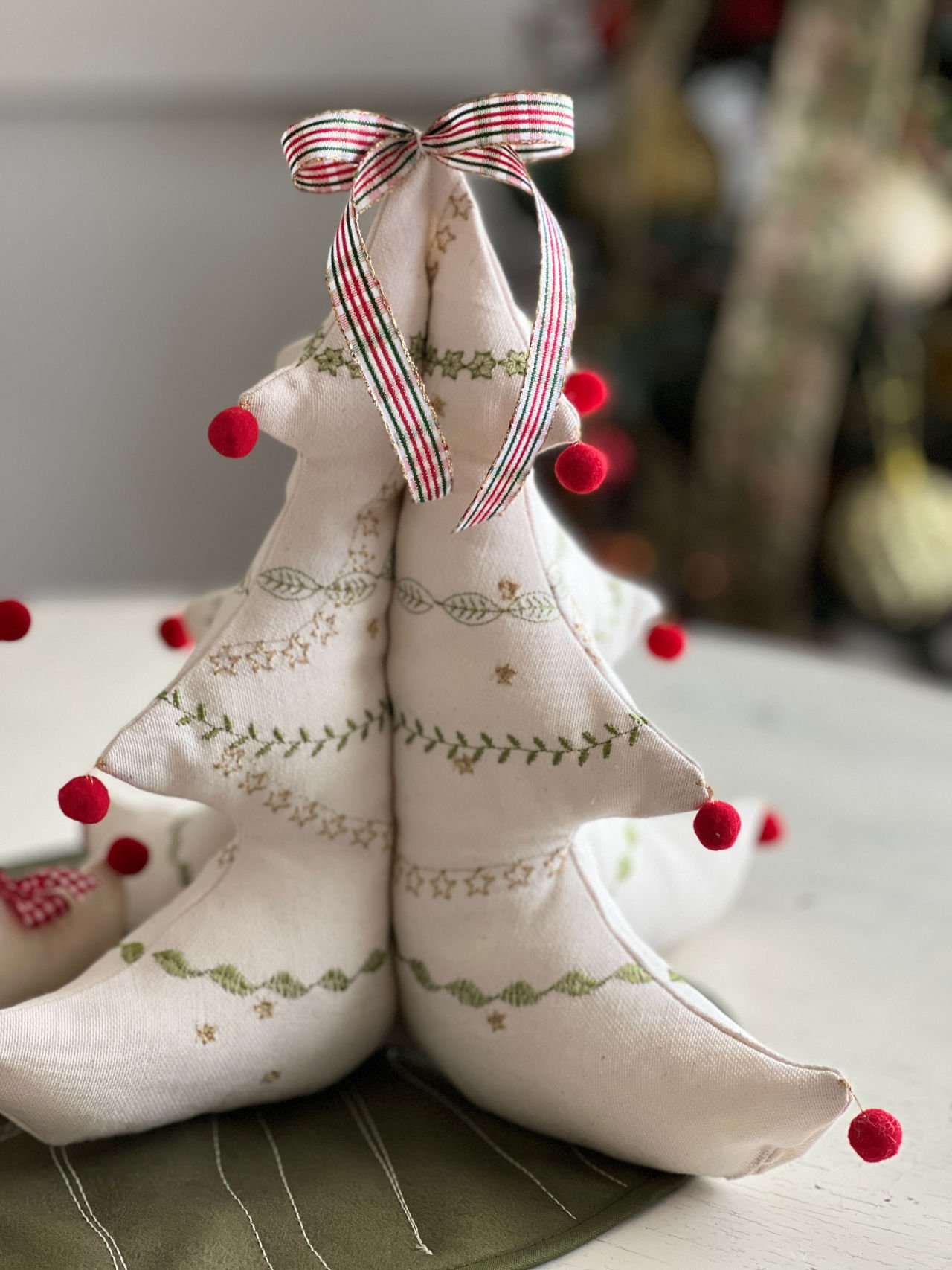 Para el arbolito: Recortes de tela, adornos a elección y vellón o guata para relleno.